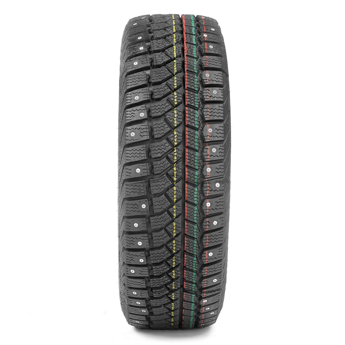 - Надёжное сцепление с дорогой при пониженном шумообразовании и долговечность шин достигается ассиметричным рисунком протектора и широким расположением шипов.